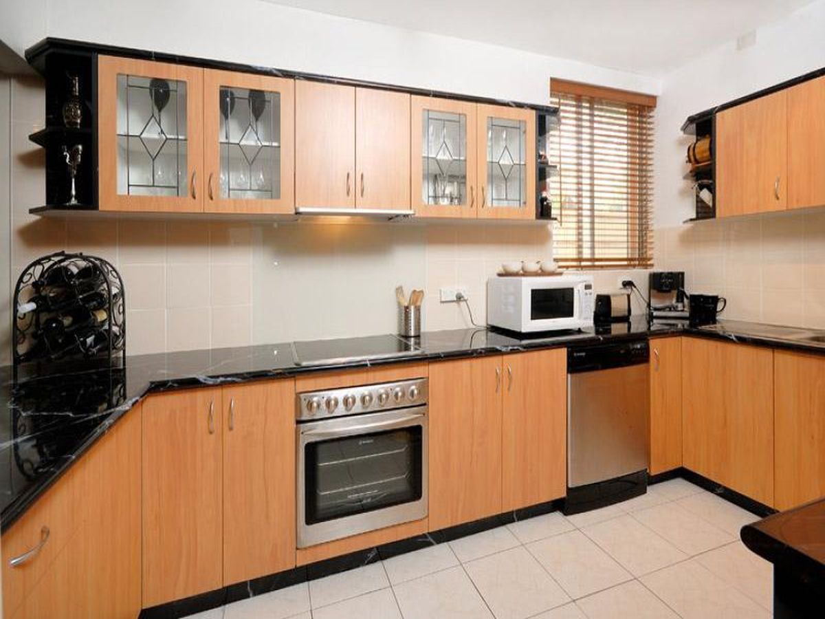 Stunning Kitchen with granite look benchtop & glass splashback